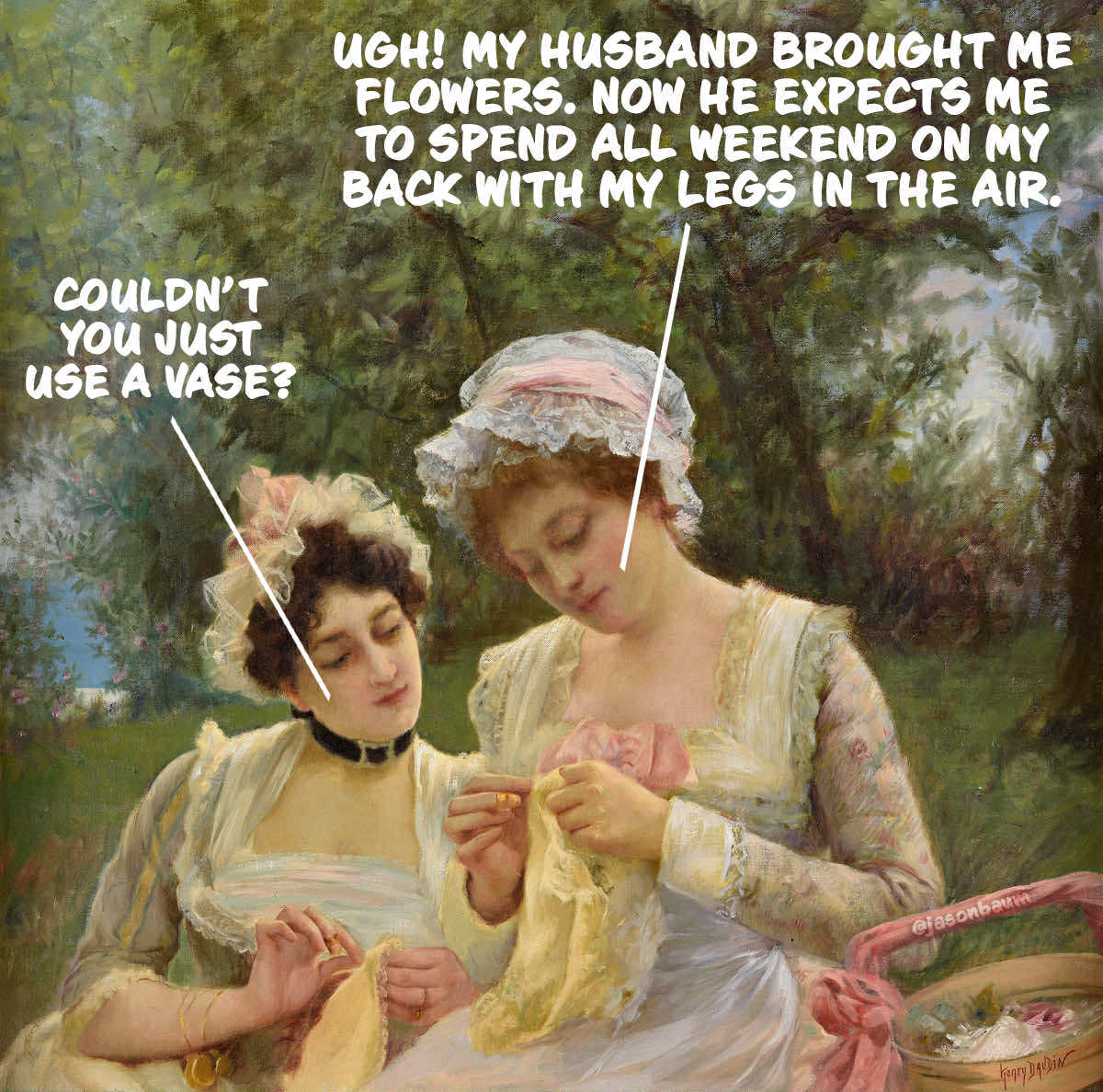 Linda’s latest labor of love is creating memes based on beautiful and little-known paintings created by women artists over the centuries and posting them to several classic art meme groups on Facebook, including The Laughing Librarian. In 2023, she created La Vie en Rose Arts, a page that celebrates great women artists – with humor.